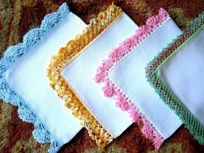 O zamanlar kağıt mendil olmadığı için, kumaş mendillerimiz olurdu, annem artmış düz renkli kumaşlardan mendil diker, kenarına iğne oyası, dantel ya da mekikle süs yapardı.Bayram elbiselerinin cebinde o mendillerden birer tane olurdu mutlaka. İç çamaşırlarımız düz renk patiskadan dikilirdi, annem açık "kavuniçi" rengini tercih ederdi bizim iç çamşırlarında. Kendisine, siyah ya da beyaz jarseden kombinezonlar dikerdi, hazır dantel olmadığı için, kendisi "örümcek" modeli ince danteller örerdi eteklerine, yakasına.